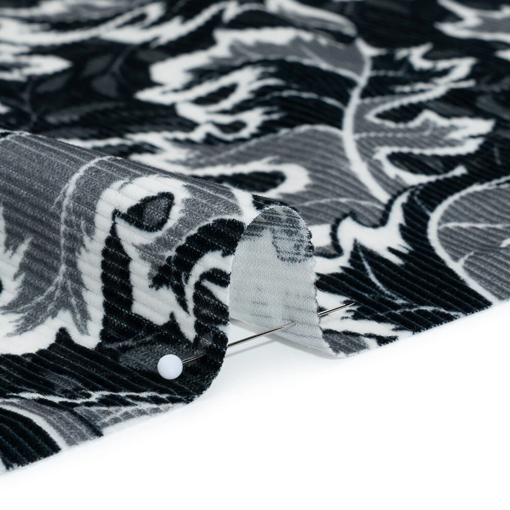 This Black, White, and Gray Oak Leaves Soft Cotton Corduroy Print combines plush texture with a stylish autumnal motif. Crafted from cotton with gentle 10% weftwise stretch, this fine-wale corduroy offers comfort, warmth, and ease of sewing. The medium-weight fabric is perfect for fall and winter garments, including pants, skirts, dresses, and tailored shirts. Its opaque weave eliminates the need for lining, while the soft velvety surface adds cozy elegance to every project. Ideal for layering or standalone pieces, this fabric brings natural charm and sophisticated texture to seasonal wardrobes.