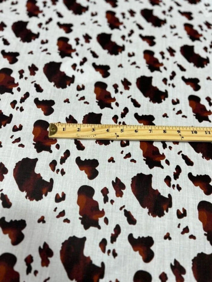 This cow print poly cotton fabric is made from a soft and breathable blend of 50% cotton and 50% polyester, delivering both natural comfort and long-lasting durability. With a bold animal-inspired design, it is ideal for stylish shirts, apparel, accessories, bags, and creative projects. Lightweight, snag-resistant, and colorfast—this USA-made fabric is great for everyday use. Sold by the yard. Machine washable (cold).